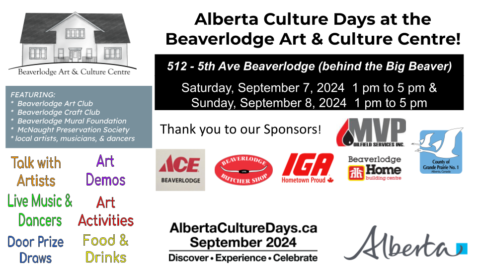 We are working with local artists, such as Vicki Hotte, Michelle Forrester and Peter von Tiesenhausen, and organizations such as the Beaverlodge Art Club, the Beaverlodge Craft Club and the Beaverlodge Mural Foundation to bring our community two days of ART! We will have music, food, and door prize draws.