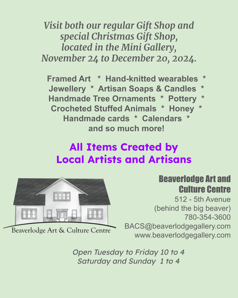 We are currently accepting submissions from local artists and artisans for this Christmas Gift Shop in the Mini Gallery.  Please contact Harmony at 780-354-3600 or BACS@beaverlodgegallery.com
