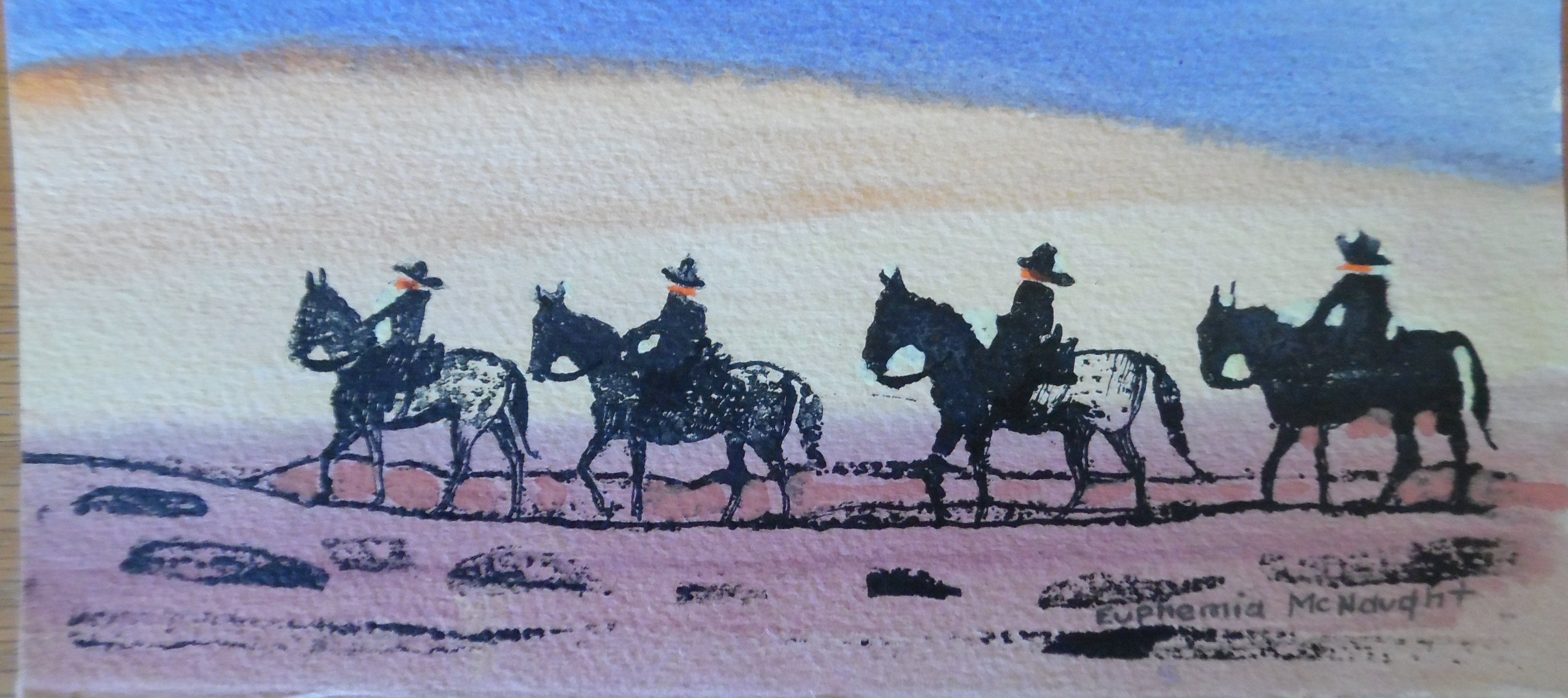 EM-009 Four Riders on Horseback Posted on November 13, 2019November 13, 2019 by Lane Euphemia McNaught Four Riders on Horseback Catalog No.EM-009 Date: 1996 Category Card Medium Stencil Dimensions: 4.25h x 9w in. Credit Line: Private Collection Markings: Notes: