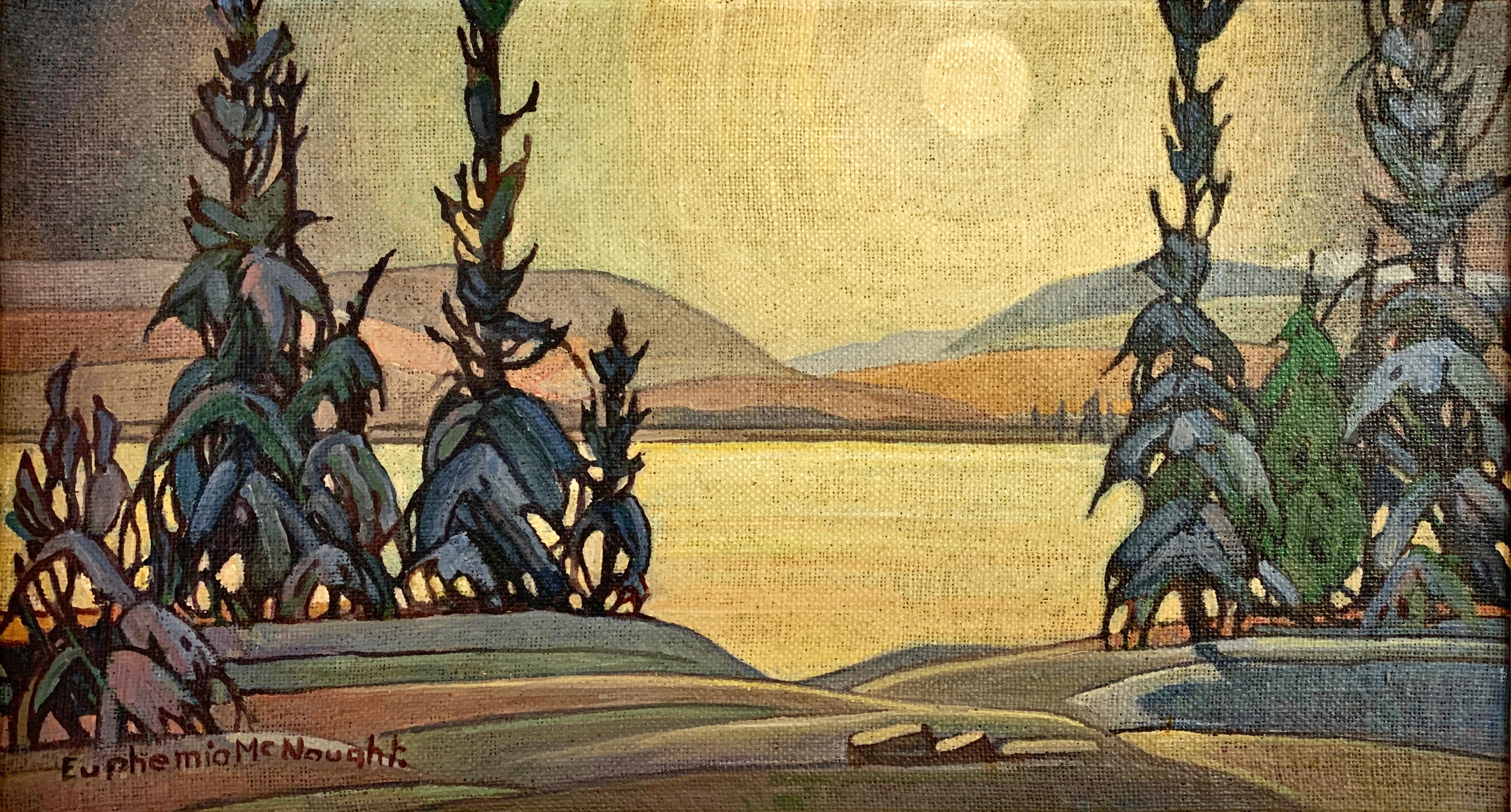 EM-042 Stony Lake in the Moonlight Posted on November 13, 2019 by Lane Euphemia McNaught Stony Lake in the Moonlight Catalog No.EM-042 Date: 1968 Category Painting Medium Oil on canvas board Dimensions: 20h x 34w in. Credit Line: Private Collection Markings: Notes: Message to John