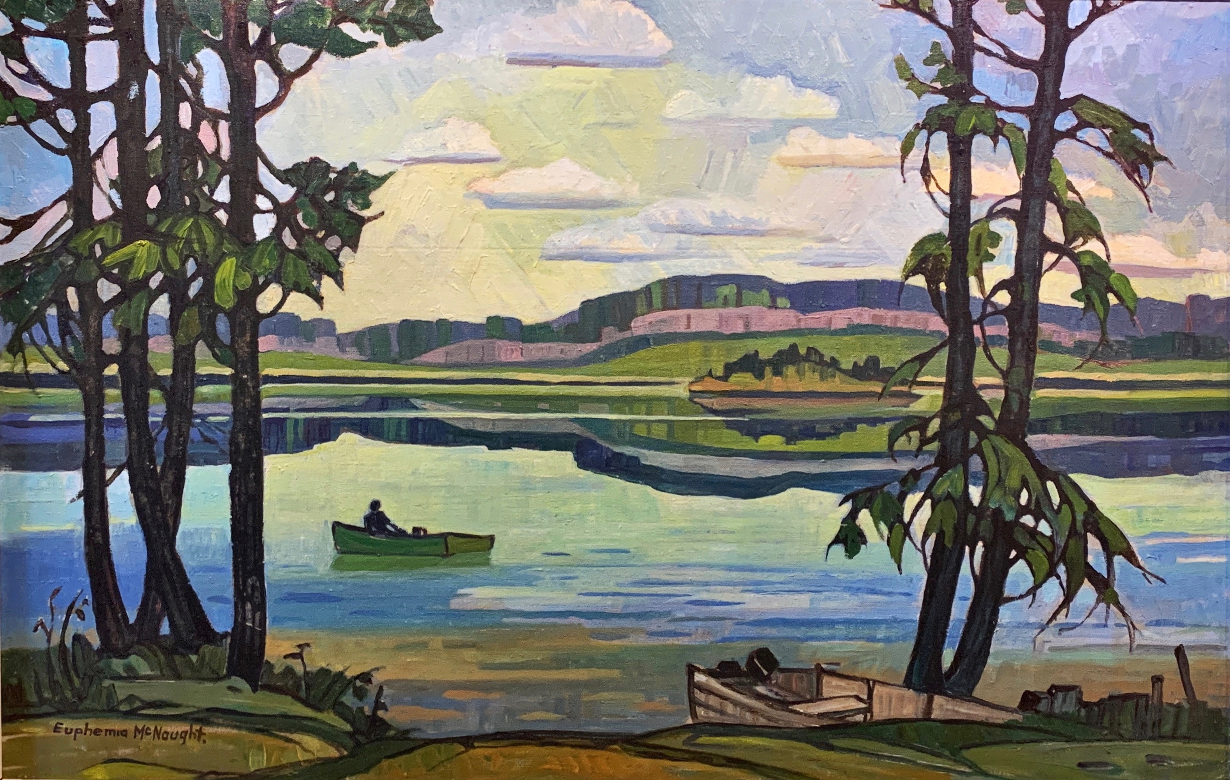 EM-045 One Island Lake Posted on November 13, 2019November 13, 2019 by Lane Euphemia McNaught One Island Lake Catalog No.EM-045 Date: 1989 Category Painting Medium Oil on canvas board Dimensions: 30h x 42w in. Credit Line: Private Collection Markings: Notes: