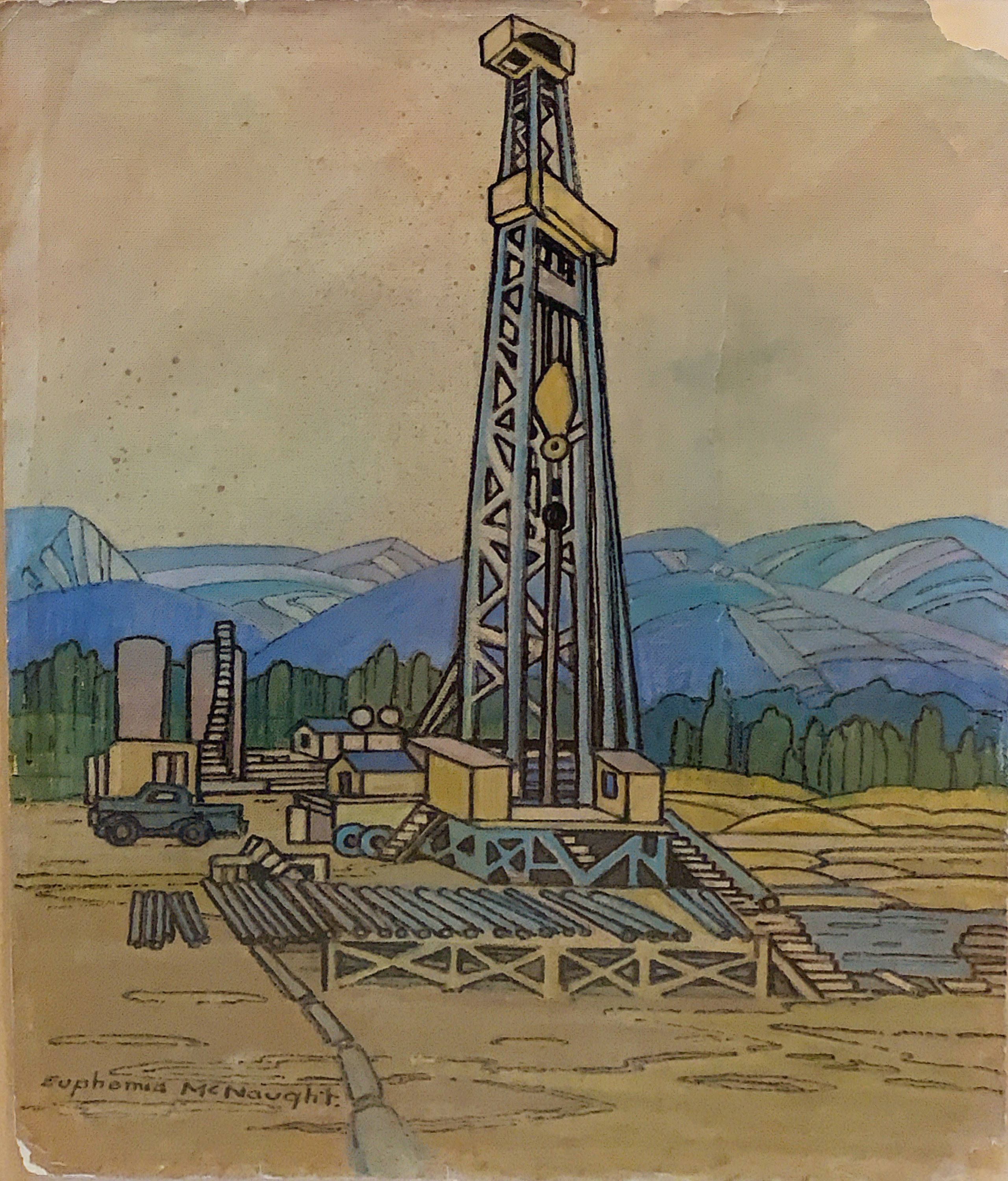 EM-062 Grizzly Valley Oil Rig Study Posted on November 13, 2019November 13, 2019 by Lane Euphemia McNaught Grizzly Valley Oil Rig Study Catalog No.EM-062 Date: nd Category Drawing Medium Colour Pencil & Pen Dimensions: 23.25h x 27.5w in. Credit Line: Private Collection Markings: Notes: