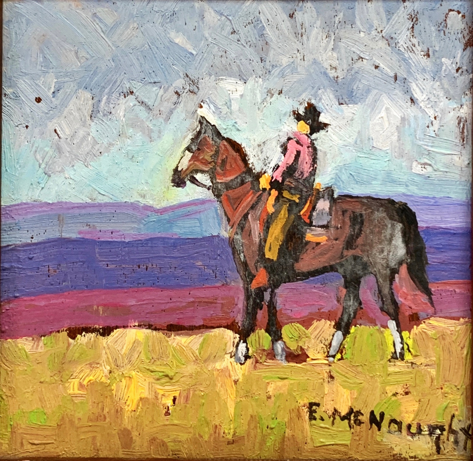 EM-159 Horse & Rider Posted on November 13, 2019November 13, 2019 by Lane Euphemia McNaught Horse & Rider Catalog No.EM-159 Date: 2000 Category Painting Medium Oil on canvas board Dimensions: 4.5h x 4.5w in. Credit Line: Private Collection Markings: Notes: