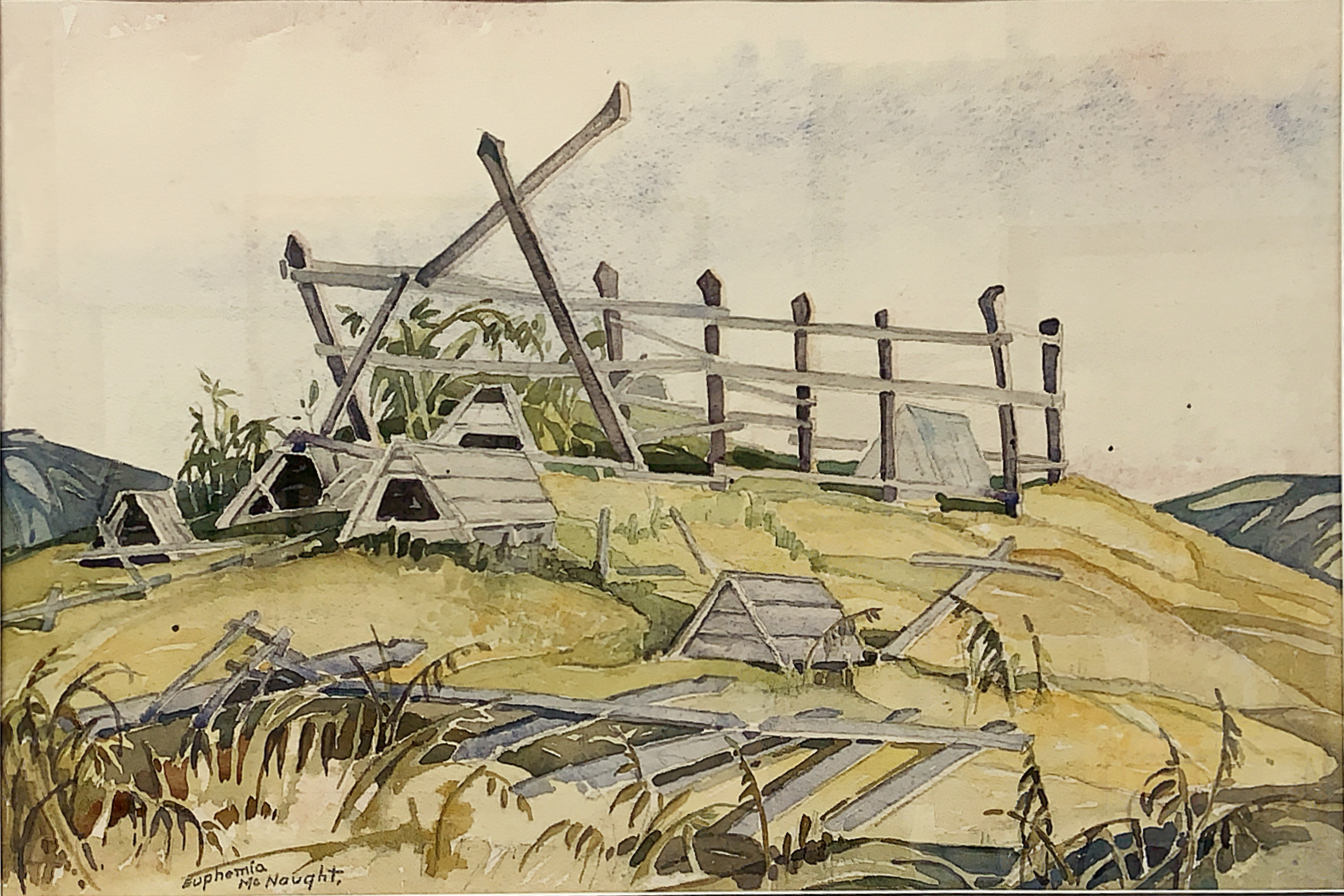 EM-165 Native Graves, Hudson Hope Posted on November 13, 2019November 13, 2019 by Lane Euphemia McNaught Native Graves, Hudson Hope Catalog No.EM-165 Date: 1981 Category Painting Medium Watercolour Dimensions: 13h x 20w in. Credit Line: Private Collection Markings: Notes: For Sale