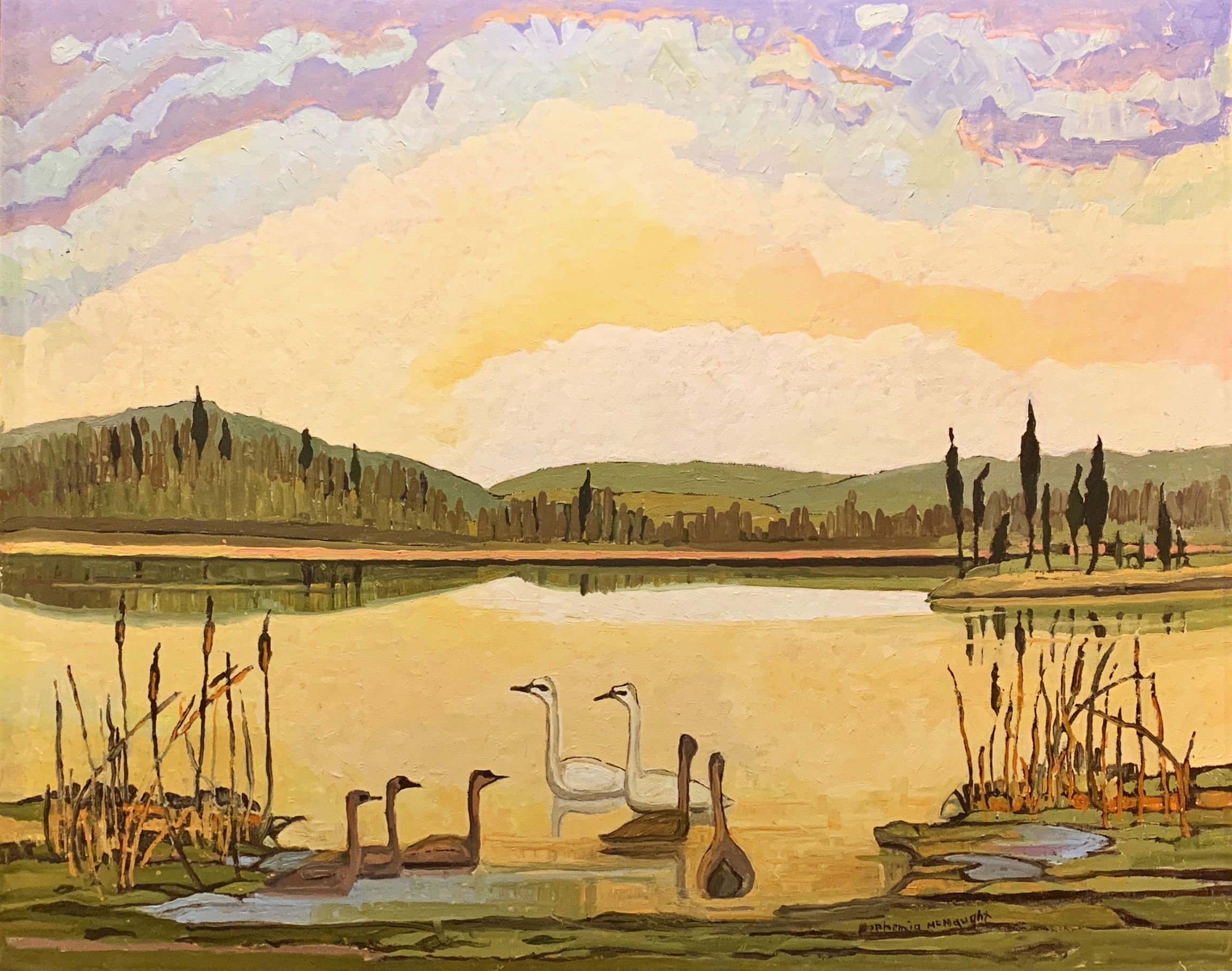 EM-171 Swans on McNaught Lake Posted on November 13, 2019November 13, 2019 by Lane Euphemia McNaught Swans on McNaught Lake Catalog No.EM-171 Date: nd Category Painting Medium Oil on Board Dimensions: 31h x 38w in. Credit Line: Private Collection Markings: Notes: