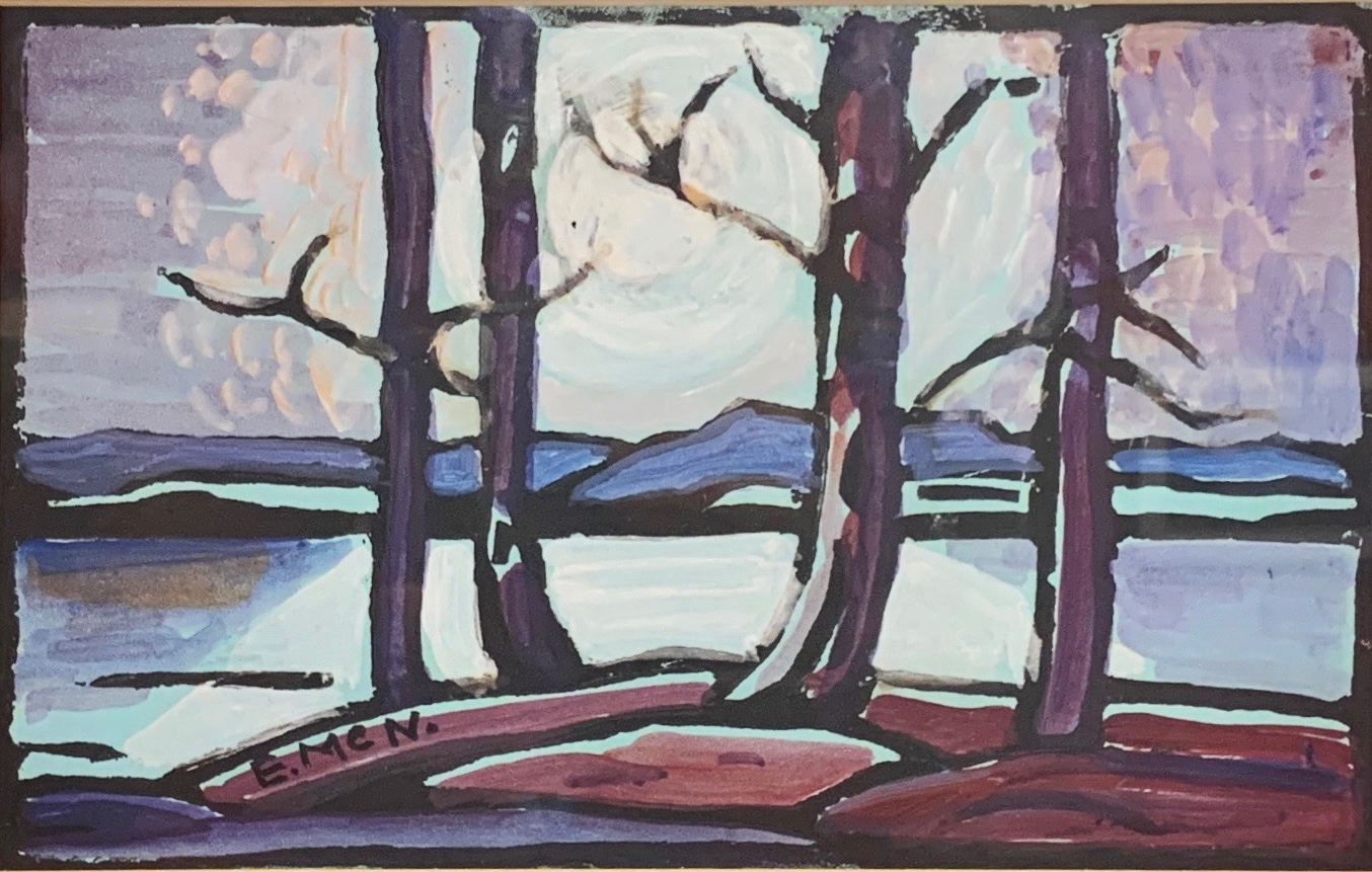 EM-182 Trees, Lake, Moonlight Posted on November 13, 2019 by Lane Euphemia McNaught Trees, Lake, Moonlight Catalog No.EM-182 Date: 1990 Category Card Medium Stencil Dimensions: 11.5h x 14w in. Credit Line: Private Collection Markings: Notes: Call to confirm