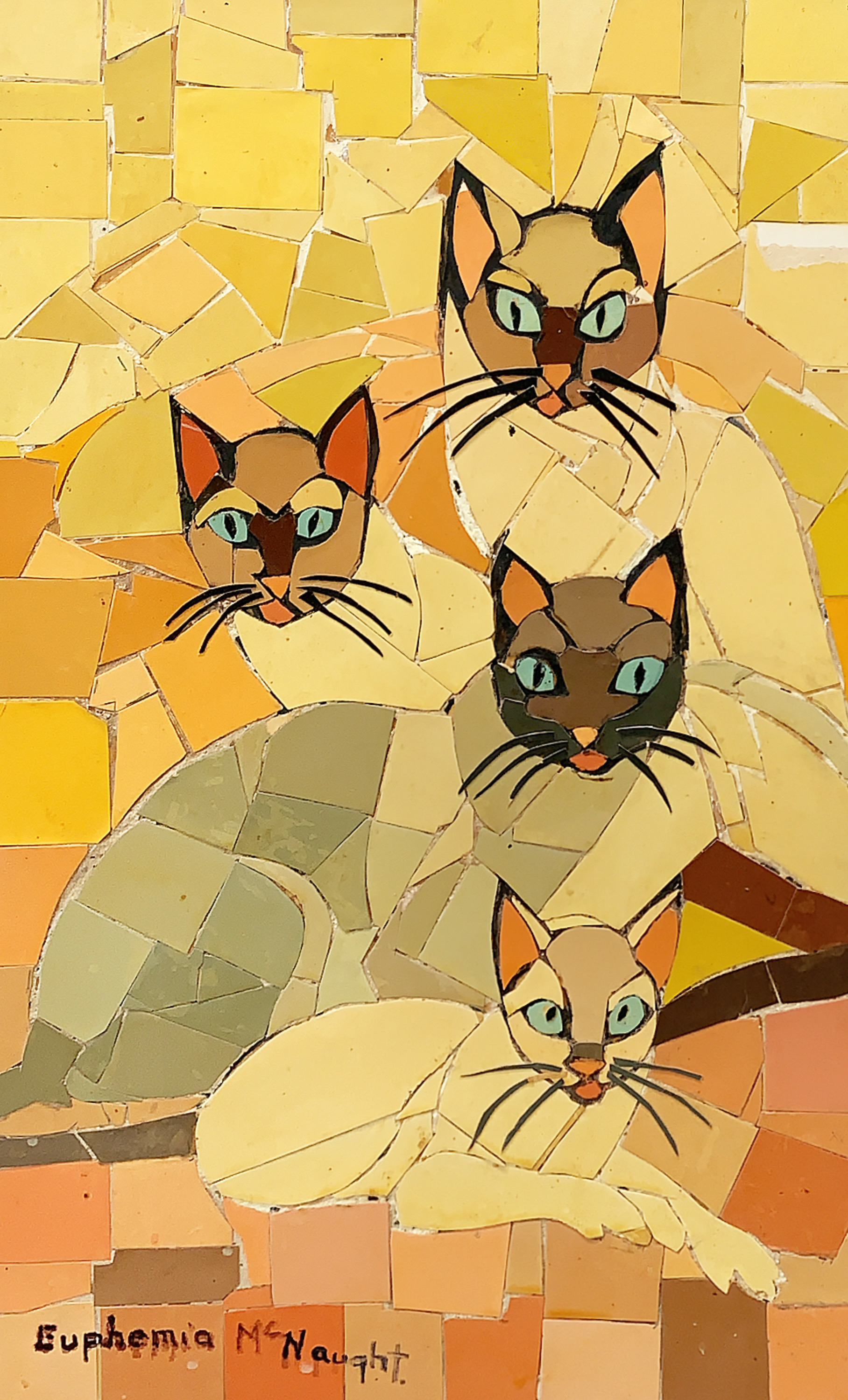 EM-219 (1) Cat Mosaic Posted on November 13, 2019November 13, 2019 by Lane Euphemia McNaught Cat Mosaic Catalog No.EM-219 (1) Date: nd Category Collage Medium Cardboard on Ply board Dimensions: 20h x 29w in. Credit Line: Private Collection Markings: Notes: