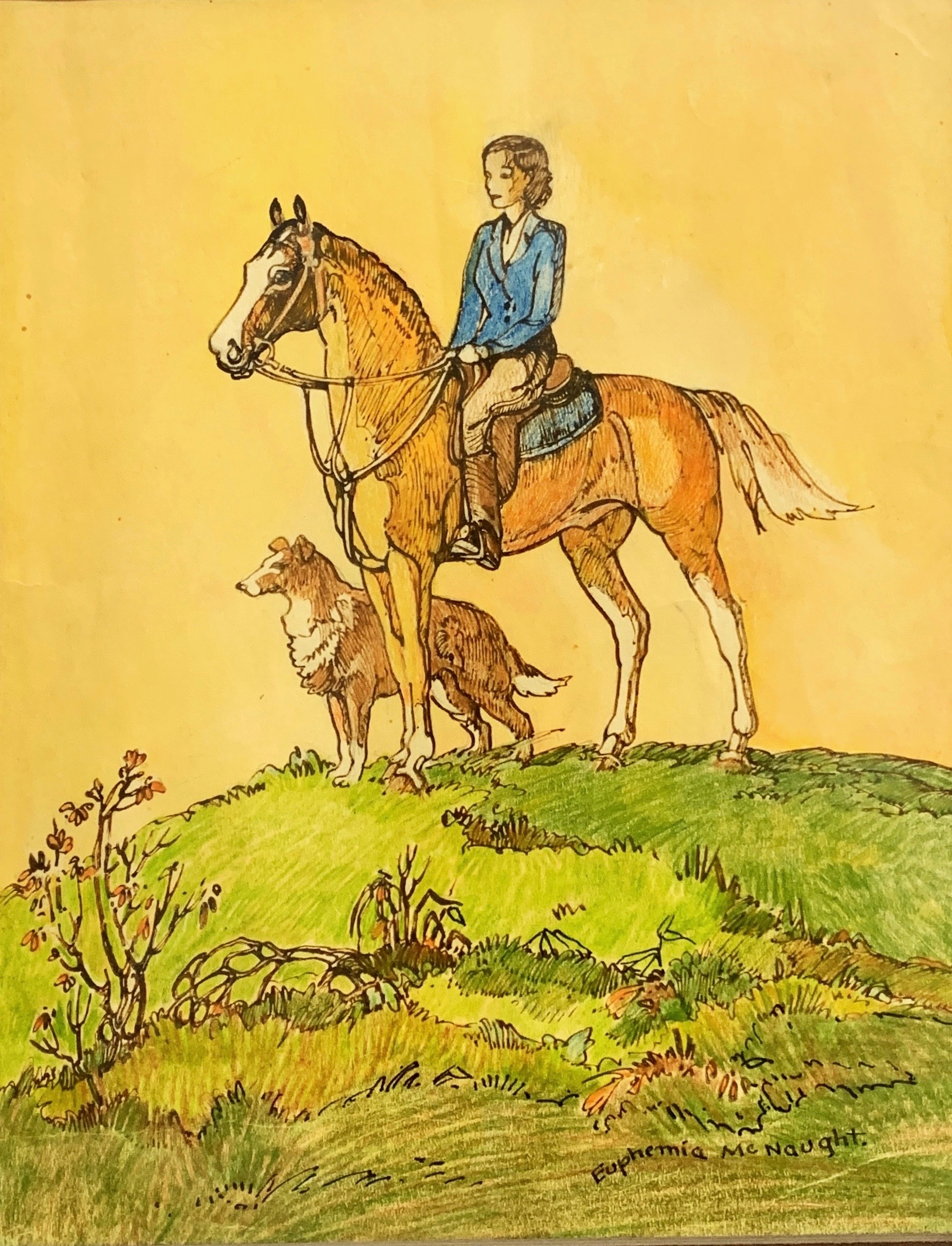 EM-223 Rider on the Hill Posted on November 13, 2019November 13, 2019 by Lane Euphemia McNaught Rider on the Hill Catalog No.EM-223 Date: nd Category Drawing Medium Pencil Crayon on Paper Dimensions: 15h x 19w in. Credit Line: Private Collection Markings: Notes: