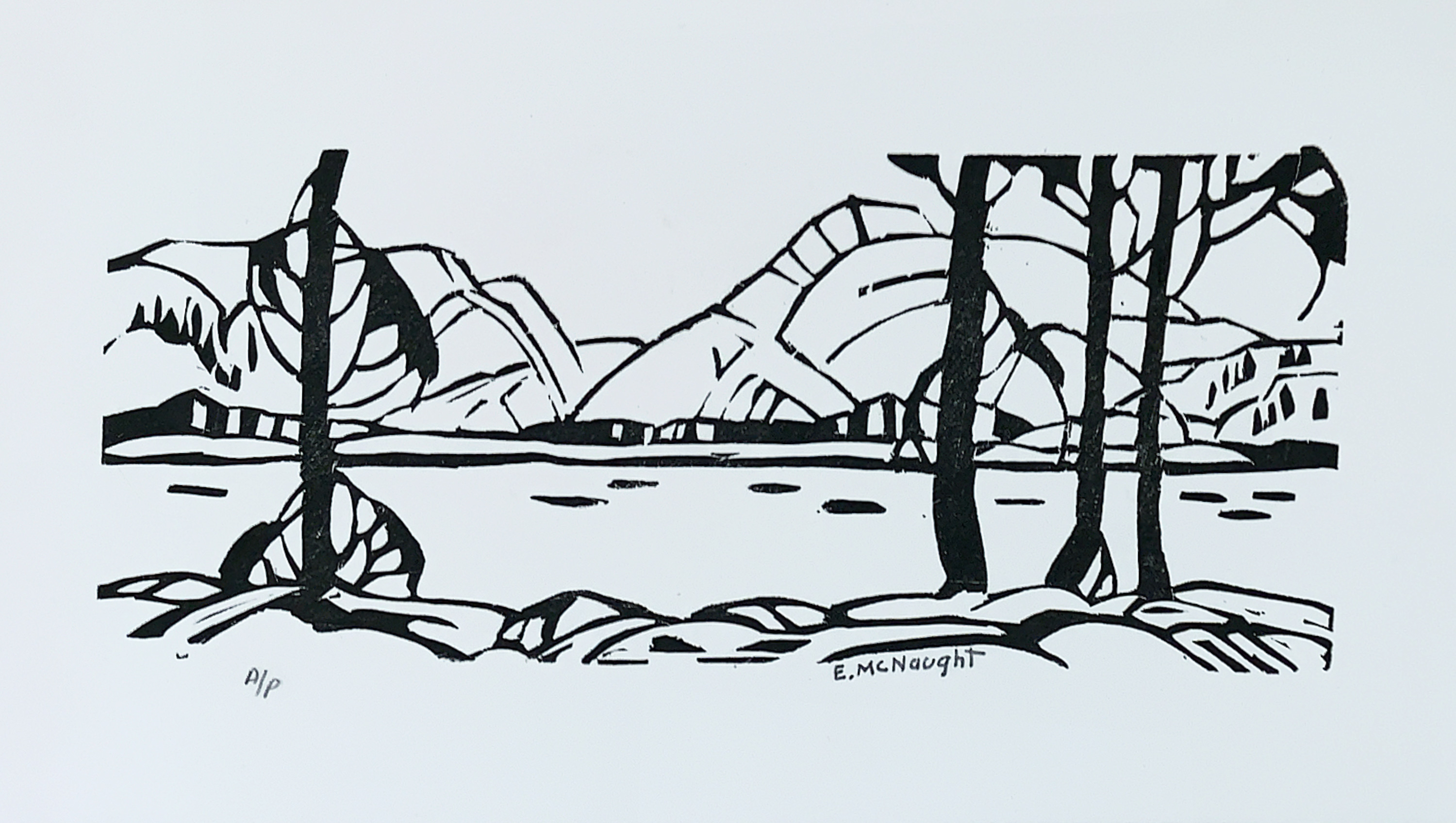 EM-235 Mountain, Lake & Trees Lino Print Posted on November 13, 2019November 13, 2019 by Lane Euphemia McNaught Mountain, Lake & Trees Lino Print Catalog No.EM-235 Date: nd Category Print Medium Block print, Ink on paper Dimensions: h x w in. Credit Line: Private Collection Markings: Notes: